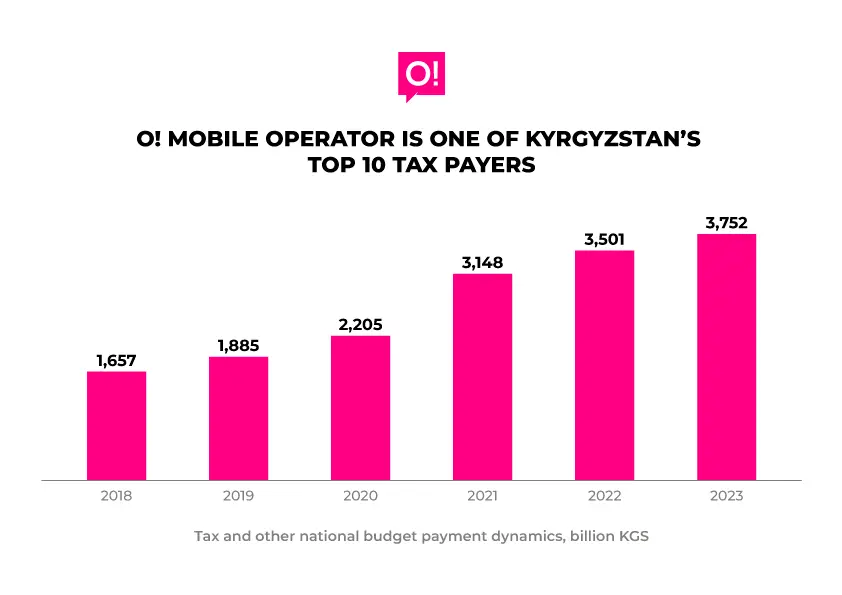 O! (NUR Telecom LLC) has for several years been among the country’s top 10 tax payers ensuring a significant input to replenishment of the national budget income among all telecom providers and strictly following the country’s tax laws. Over the 15 years, the company has been demonstrating continuous growth of tax and other payments to the national budget. A sharp spike took place over the last years because of the company’s technical development. A growing number of users choose high quality and innovations. In 2023, O! topped up the public treasury by the record amount of 3.752 billion KGS.
